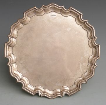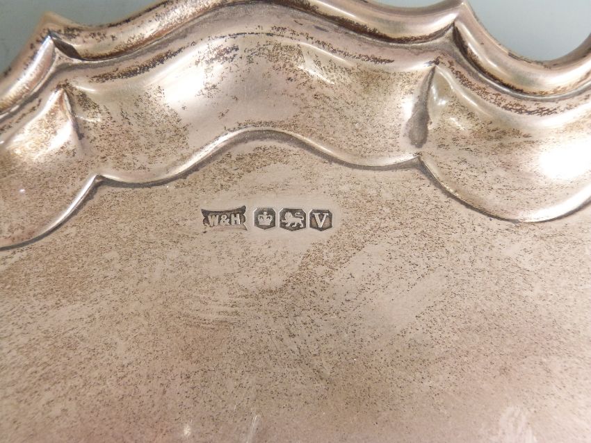 Walker and Hall George VI hallmarked silver salver with shaped edge raised on three scroll feet, Sheffield 1938, diameter 31.5cm weight 912g