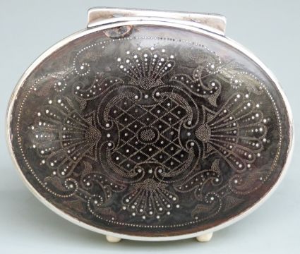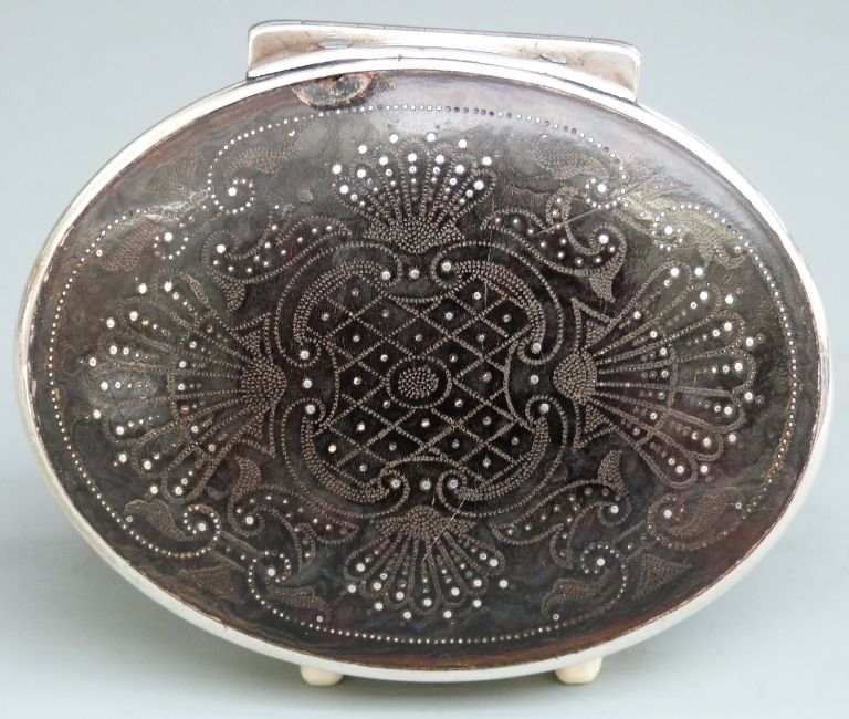 18th century silver mounted tortoiseshell and silver pique and stud work oval snuff box, width 82mm