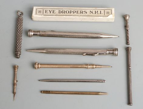 Nine propelling and other pencils and tools to include Mordan, yellow metal Victorian example with agate top, two Dunhill examples etc