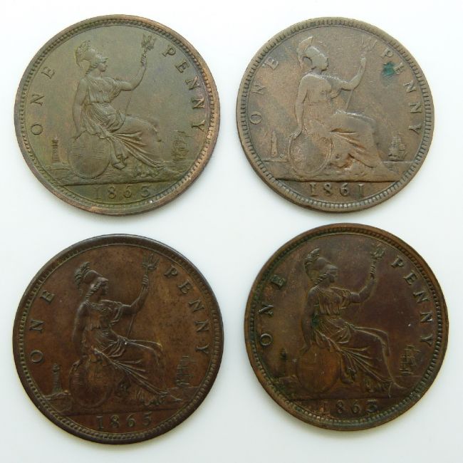 Victorian young head bronze pennies comprising two 1863 examples both VF, an 1865 EF example and an 1861 F
