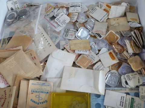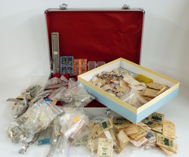 A large collection of watch parts and accessories including gold plated and stainless steel bracelets, crowns, buckles etc together with a travelling watch case.