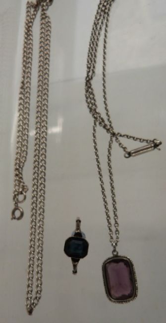 A silver ring, a silver pendant and chain, a Victorian gilt knot brooch, Victorian gold plated brooch, etc