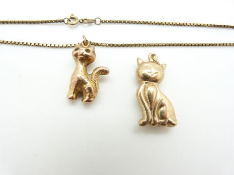 A 9ct gold necklace, two 9ct gold cat pendants, 9ct gold necklaces and a 9ct gold star necklace, 20.2g