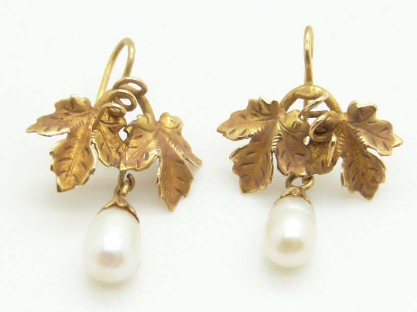 A pair of Victorian earrings in the form of ivy leaves with drop pearls, 2.5g