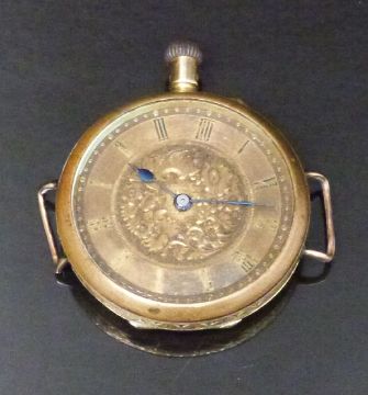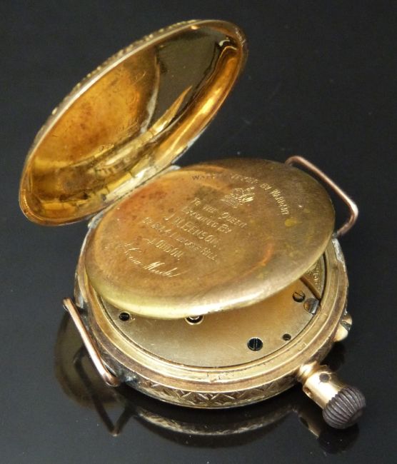 J W Benson 18ct gold cased keyless winding open faced pocket watch with blued hands, black Roman numerals, engraved self coloured dial, engraved case, unsigned movement and applied lugs for use as a wristwatch, case diameter 34mm, serial number 957234, 29.6g.