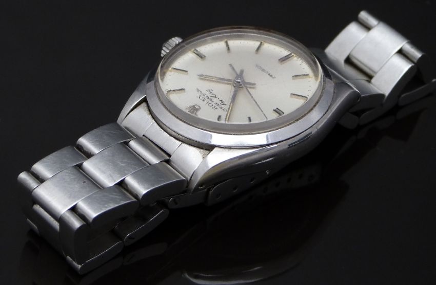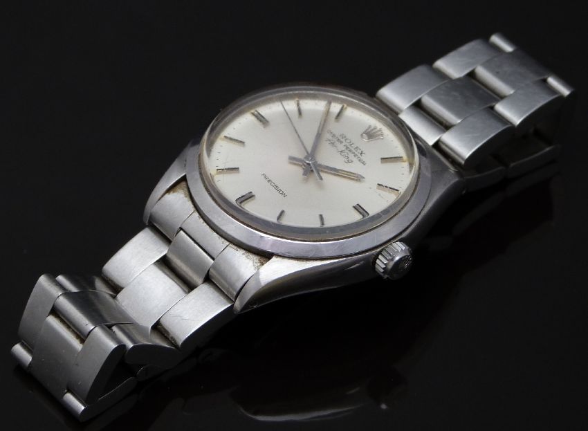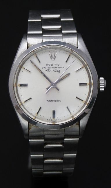 Rolex Oyster Perpetual Air King Precision gentleman's wristwatch ref. 5500 with luminous steel hands and baton markers, silver dial and 26 jewel calibre 1520 movement, on stainless steel bracelet, case diameter 32mm, serial number 5720719, in original box with guarantee.