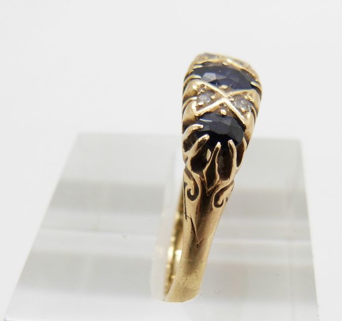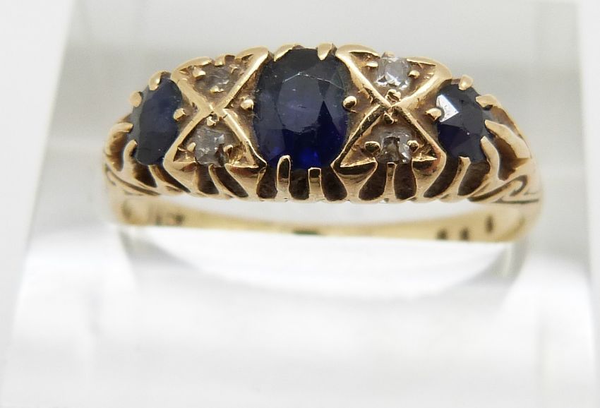 Edwardian 18ct gold ring set with sapphires and diamonds, 4.2g, size O