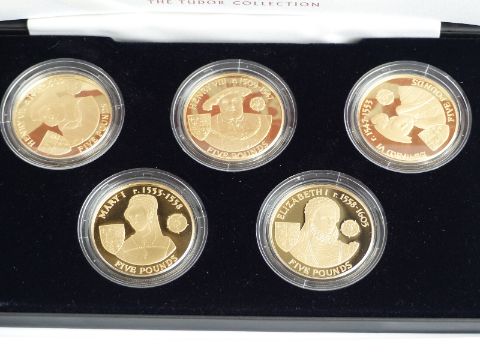 Cased set of five Royal Mint gold plated silver proof crown sized coins commemorating the History of the Monarchy, with certificates