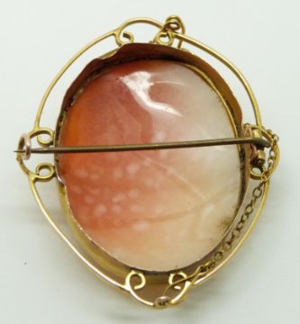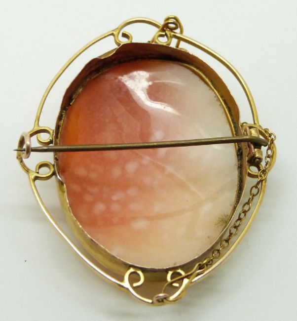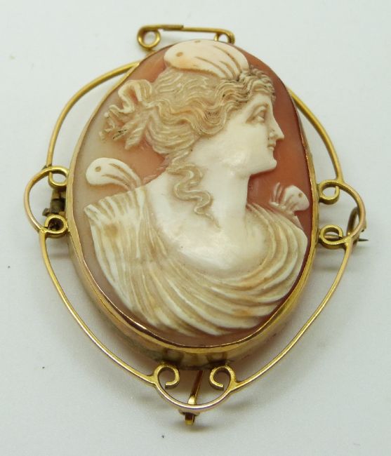 Victorian yellow metal brooch set with a cameo depicting a lady, 4 x 4.8cm