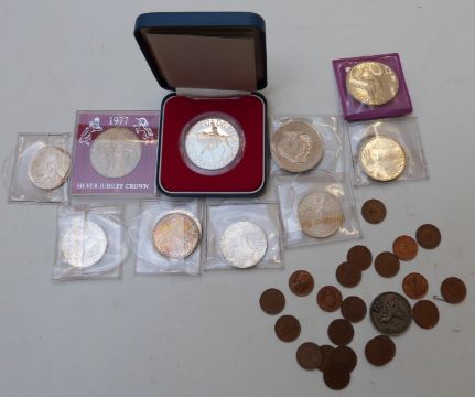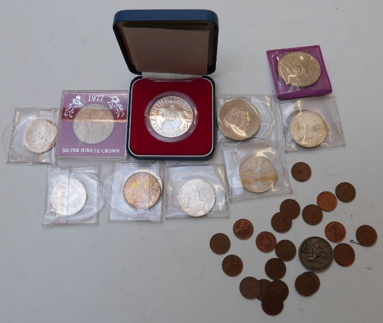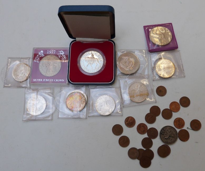 A small collection of commemorative coins etc including seven silver 1972 Munich Olympic examples, and a Ludwig II 1845-1886 medal, US dollar, silver 1977 crown etc