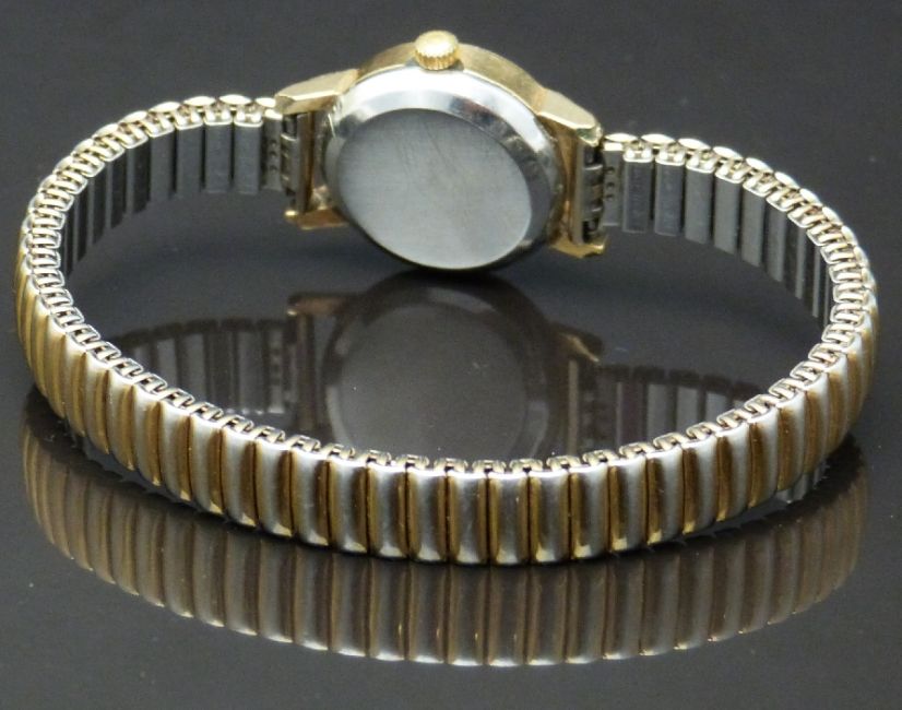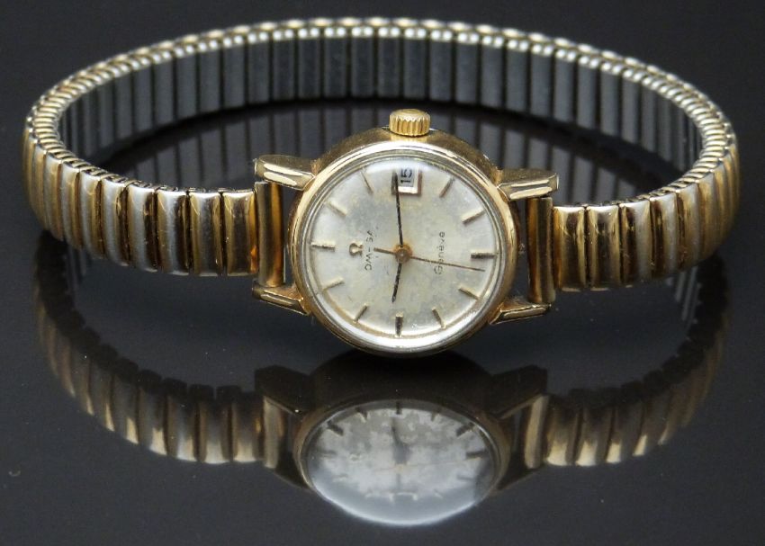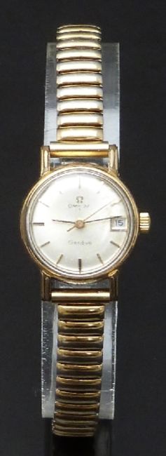 Omega gold plated ladies wristwatch with date aperture, black hands, gold centre seconds hand and markers and silver dial, on expanding metal bracelet, case diameter 20mm.