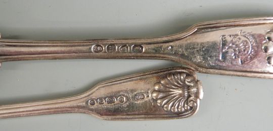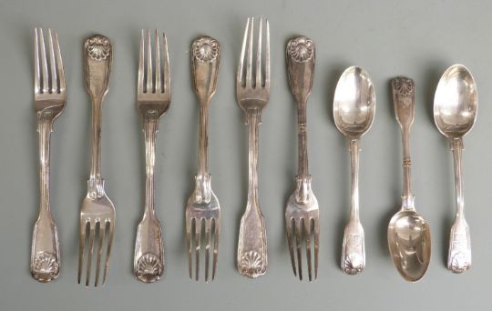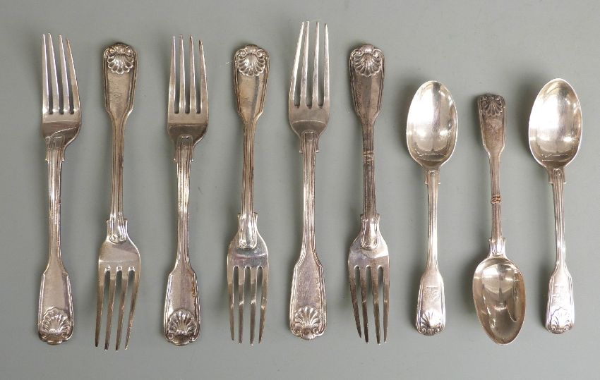 Six FiddleThread and Shell pattern desert spoons, various dates and makers circa William IV, length 17cm, together with three Victorian Fiddle Thread and Shell pattern teaspoons, weight 458g
