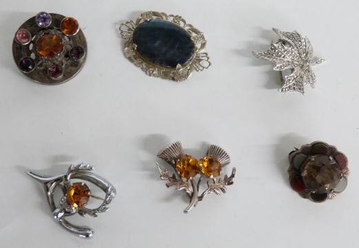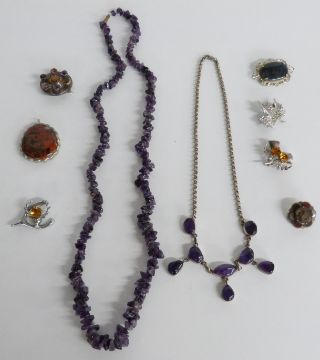 A collection of mainly Scottish jewellery including silver Scottish brooch in the form of two thistles by WBS, a Victorian Scottish brooch set with foiled stones, a silver necklace set with amethyst cabochons, a Victorian silver Scottish brooch set with a smoky quartz and agate etc