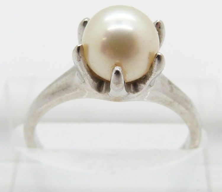 A 14ct white gold ring set with a pearl, 2.9g, size M