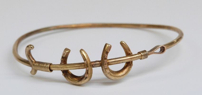 Edwardian bangle in the form of horseshoes and and crop marked 15ct gold, 4.6g, 5.6 x 5.2cm
