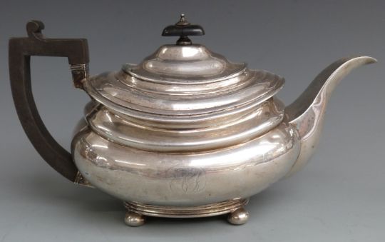 Georgian hallmarked silver teapot raised on four ball feet with ebonised handle, London circa 1830 but marks rubbed, length 29cm weight 722g all in