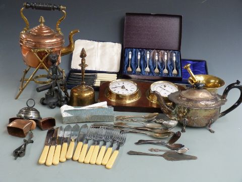 Copper spirit kettle on stand, brass pestle and mortar, cased cutlery, barometer etc