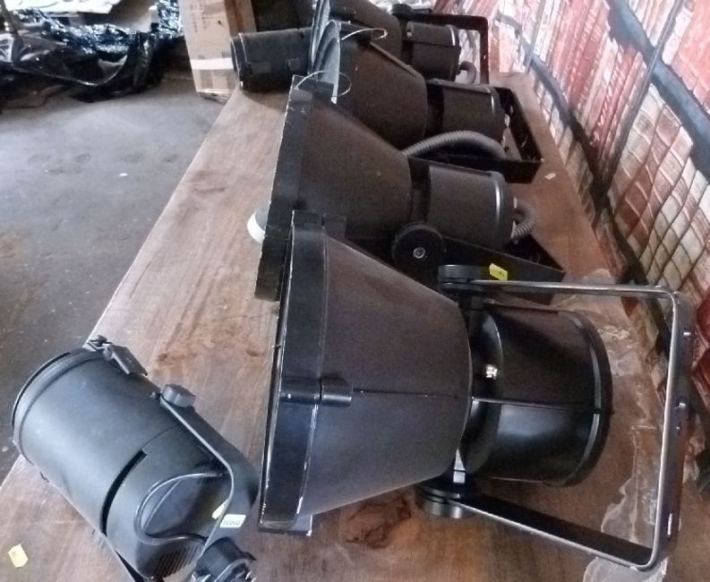 Industrial/haberdashery/shopfitting six heavy industrial lights with integral brackets, largest diameter 29cm