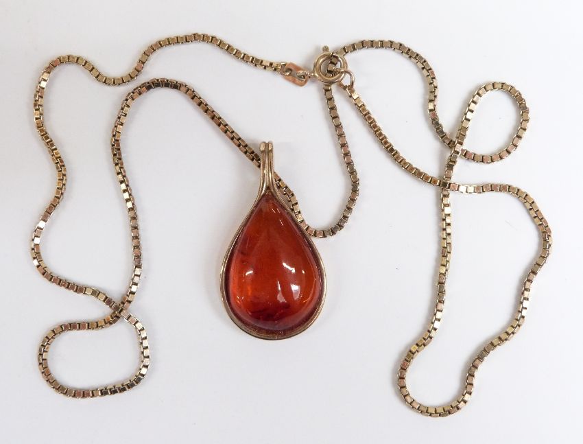 A yellow metal pendant marked 333 set with a pressed amber cabochon on a silver gilt chain