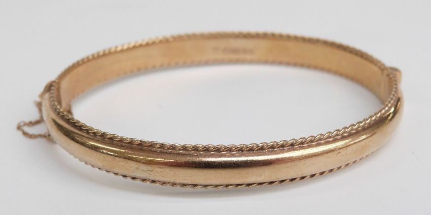 9ct gold bangle with rope twist border, 10.62g, 6.1 x 5.4cm