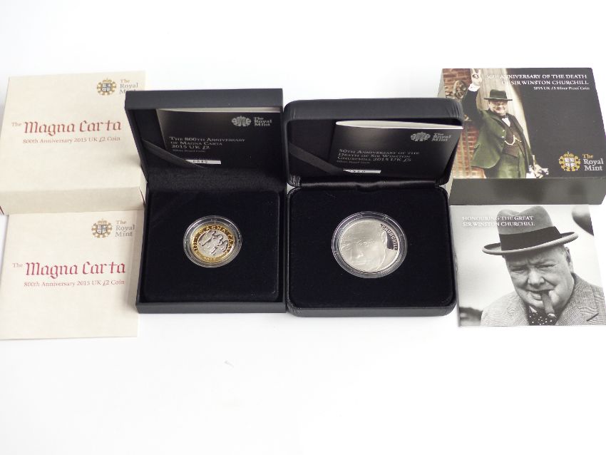 Five silver coins comprising two crowns, Magna Carta two pound, Royal Canadian Mint twenty dollar coin and  Churchill £5 coin