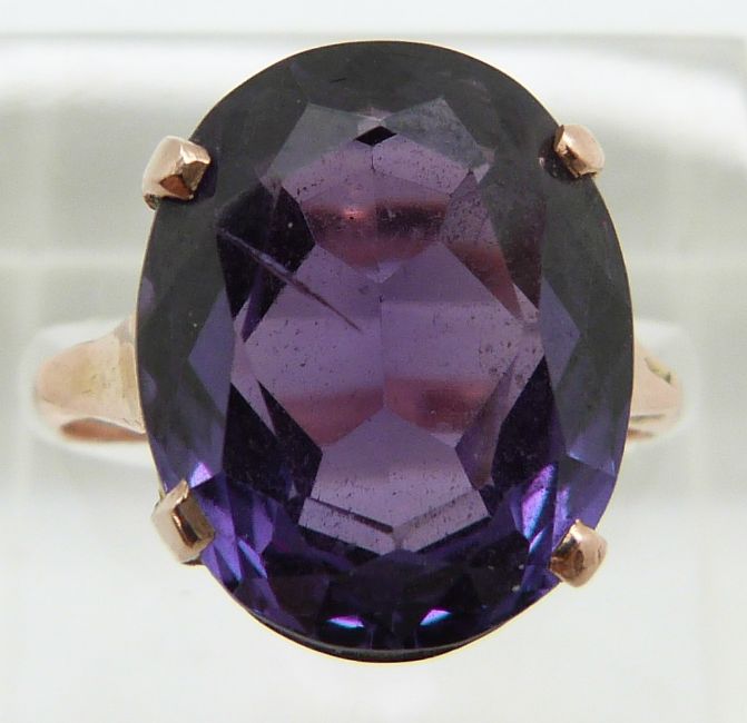 A 14ct gold ring set with a large synthetic colour change sapphire, 4.9g, size P