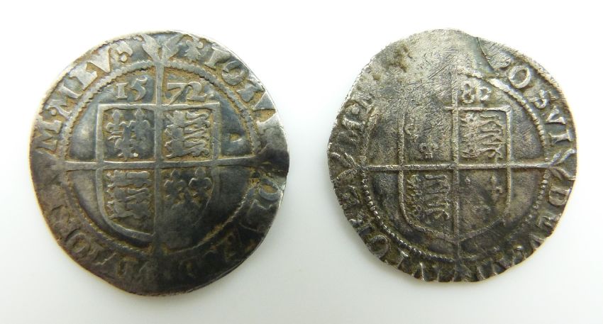 Two Elizabeth I (1558-1603) hammered silver rose sixpences for 1572 and 1580, F-F+