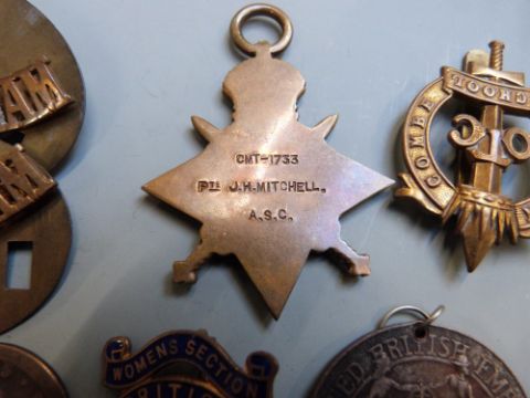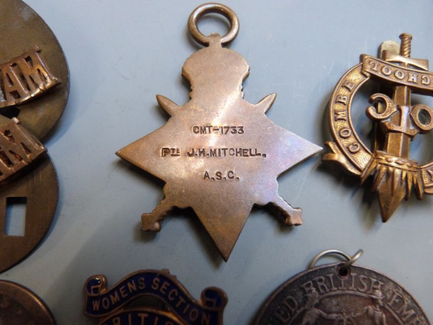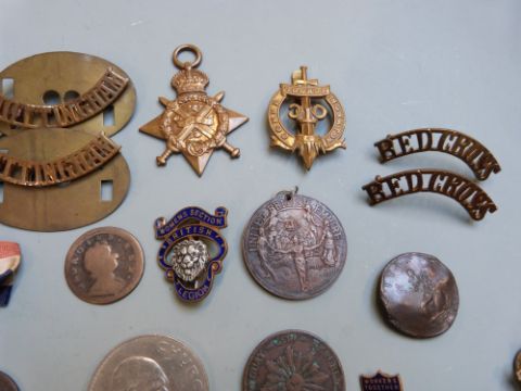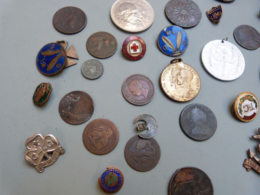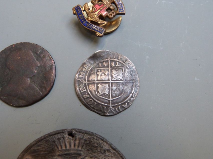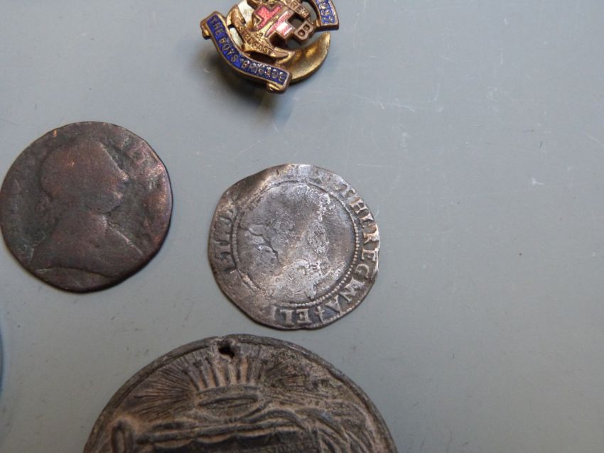 Small collection of coins and badges including Elizabeth I hammered sixpence 1582