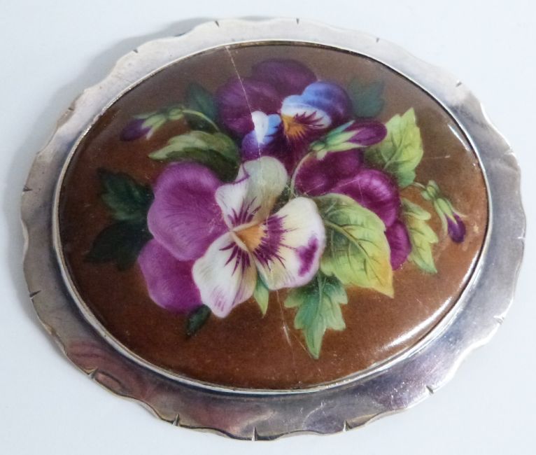 A silver brooch set with a painted plaque depicting a pansy and a miniature painting on ivory in a pendant mount