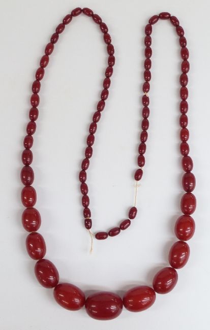 A cherry amber necklace of 77 graduated oval beads, the largest 35.6x27.1mm, 144g.