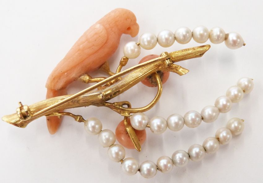 An 18ct gold brooch in the form of a parrot on a branch, the parrot of carved coral set with a diamond eye, the branches set with pearls, width 4.2cm x length 6.2cm