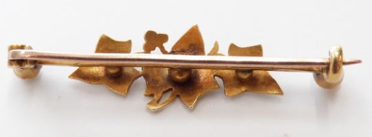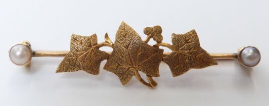 An 18ct gold ivy brooch set with two pearls, 2.5g, 3.5cm