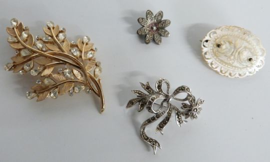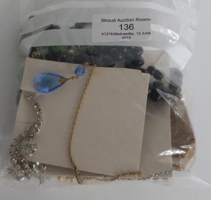 Trifari brooch, glass black beads, a fob, a stud set in original box, paste necklace, mother of pearl brooch etc