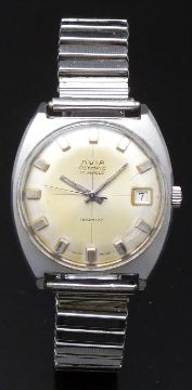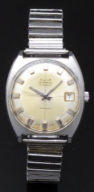 Two Avia gentleman's wristwatches comprising an Olympic with date aperture, silver hands, markers and dial and stainless steel case and one other with gold hands and hour markers, silver dial and gold plated case, both on expanding bracelets.