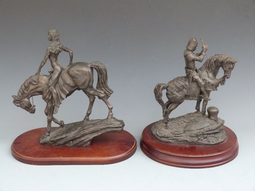 Pair of Heredities bronzed figures on horseback, one Lady Godiva the other St. Crispin's Day, height 37cm