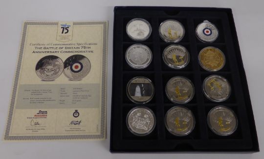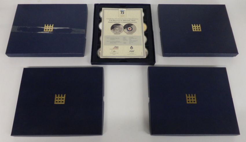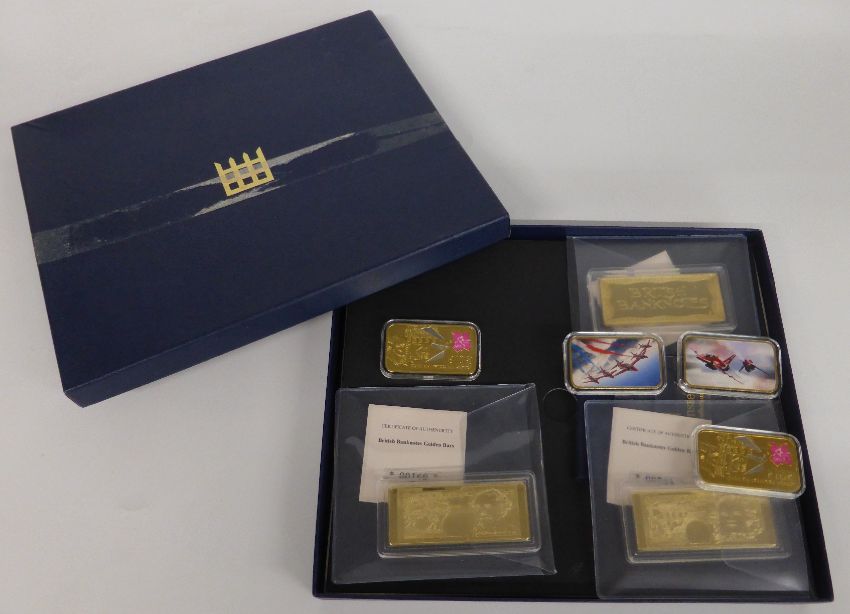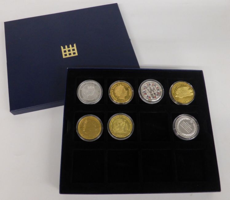Forty three various commemorative crown sized coins in Westminster coin trays, including gold plated and enamelled picture examples, together with seven commemorative ingots. some with certificates