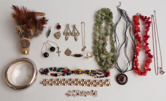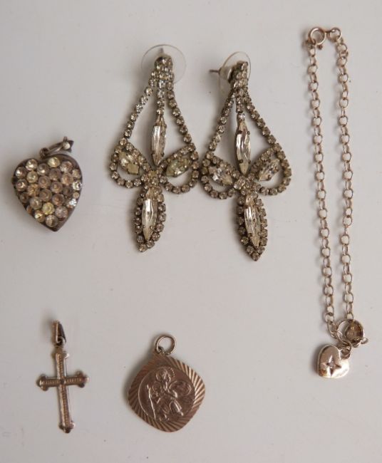 A collection of costume jewellery including agate beads, diamanté earrings, De Farre bracelet, Victorian heart pendant set with paste, silver St Christopher, silver ring, glass necklace, etc