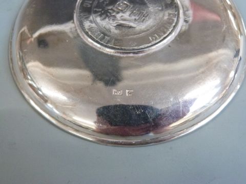 Chinese white metal coin inset pin tray with maker's mark H.C, diameter 9.5cm, weight 68g