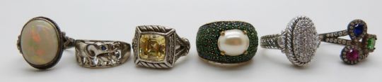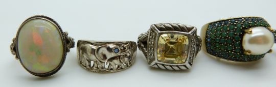 A silver ring depicting elephants set with sapphire eyes, a silver ring set with a ruby, sapphire, and cubic zirconia by Tova, a silver ring set with a white opal cabochon etc