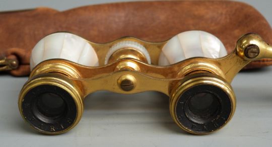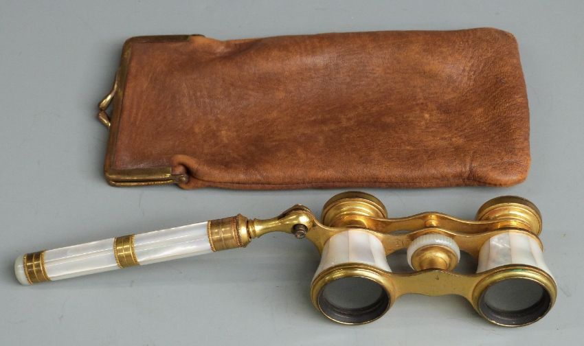 Pair of mother-of-pearl opera glasses marked Iris, Paris, in kid leather purse