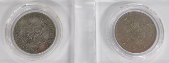 A collection of UK shillings in glass topped collector's case around 50 in all including some pre-1947, and a Victorian Jubilee example
