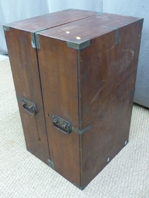 19thC mahogany campaign bookcase with brass protective fittings and steel handles, opening to reveal two sets of adjustable shelves behind doors, size when open W92 x D22 x H76cm, formerly the property of VB Douglas Cooper who was an engineer on the Aswan Dam