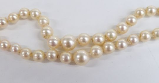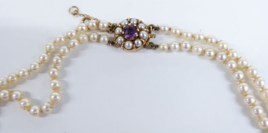 A double strand of cultured pearls with a 9ct gold clasp set with an amethyst