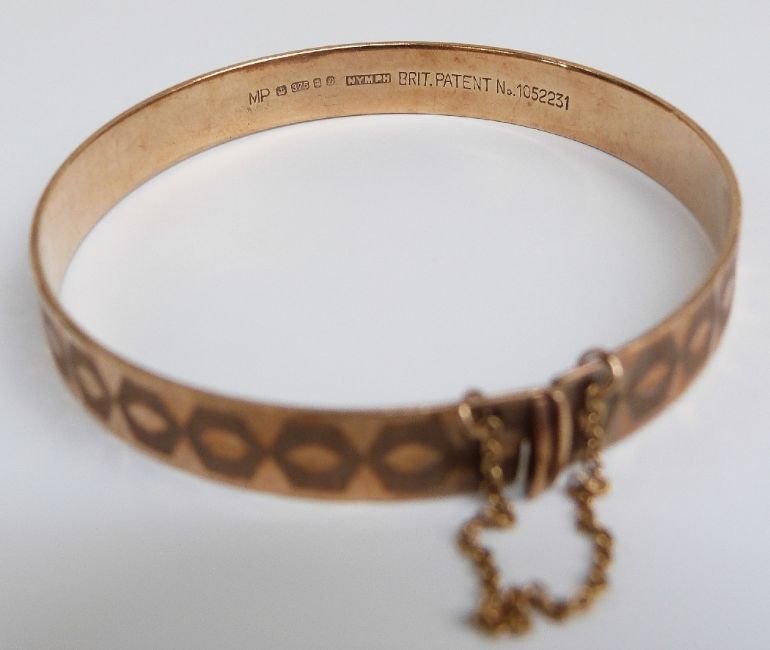 9ct gold bangle by Nymph, 15.3g, diameter 5.6cm