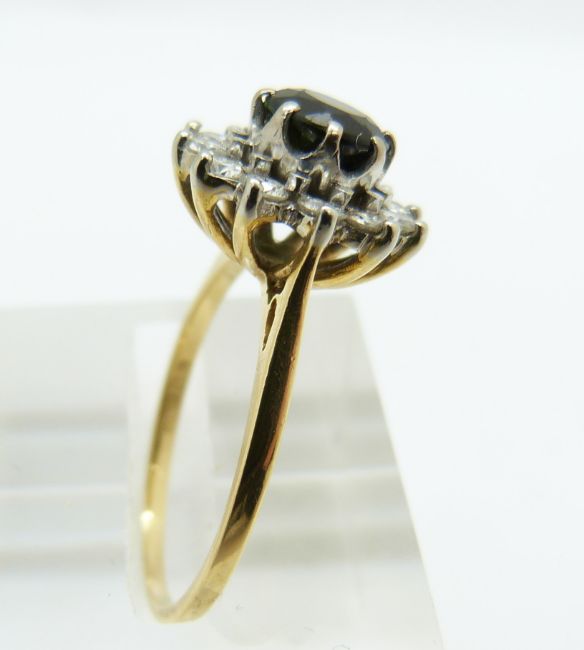 An 18ct gold ring set with a round cut tourmaline surrounded by diamonds, 3.7g, size O