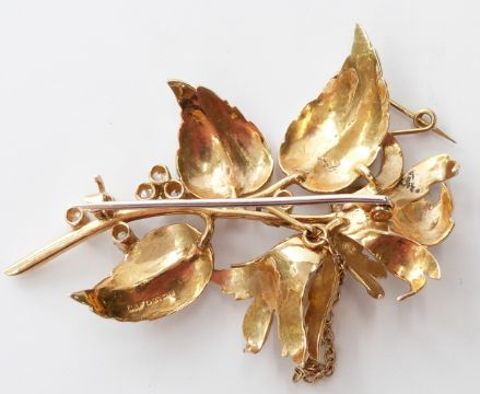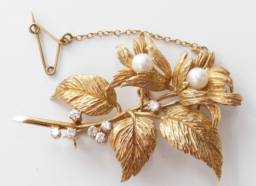 An 18ct gold brooch in the form of a flower set with pearls and diamonds, 13.4g, width 5.5cm x length 4cm