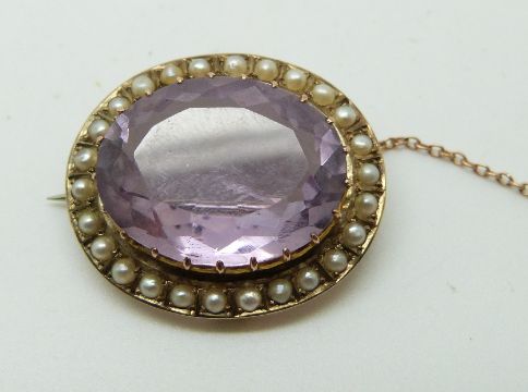 Edwardian 9ct gold brooch set with an oval cut amethyst and seed pearls (2.5 x 2cm)