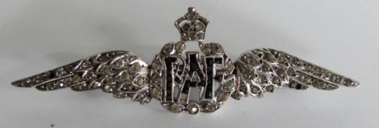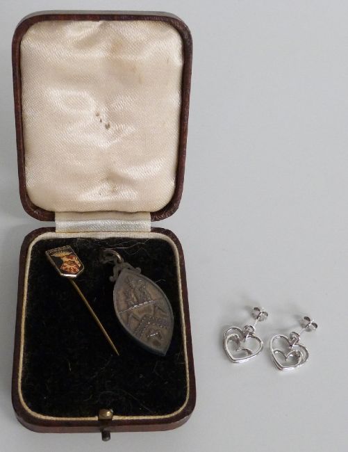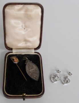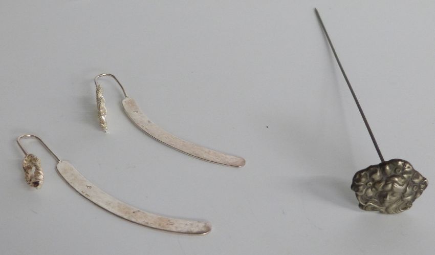 Art Nouveau silver hat pin, a silver RAF brooch, silver medallion/ pendant, silver bookmarks and silver earrings set with a diamond