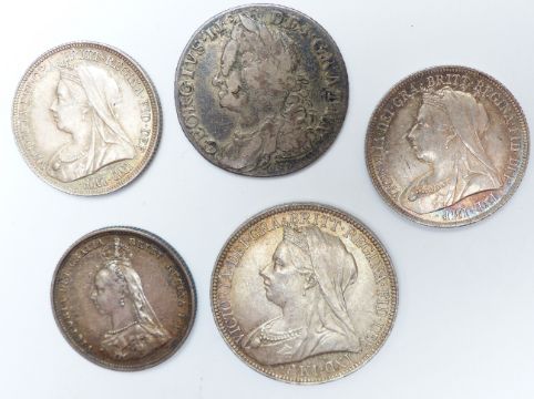 A collection of Victorian silver coins, mostly VF, and a 1758 George II shilling with overstruck 'H'