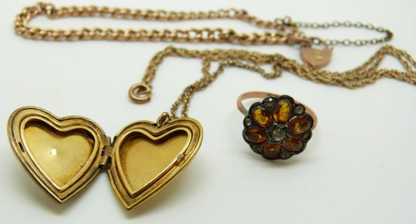 A 9ct gold bracelet, 3.2g 8cm drop, 9ct gold chain 2g and a 9ct gold and silver ring.